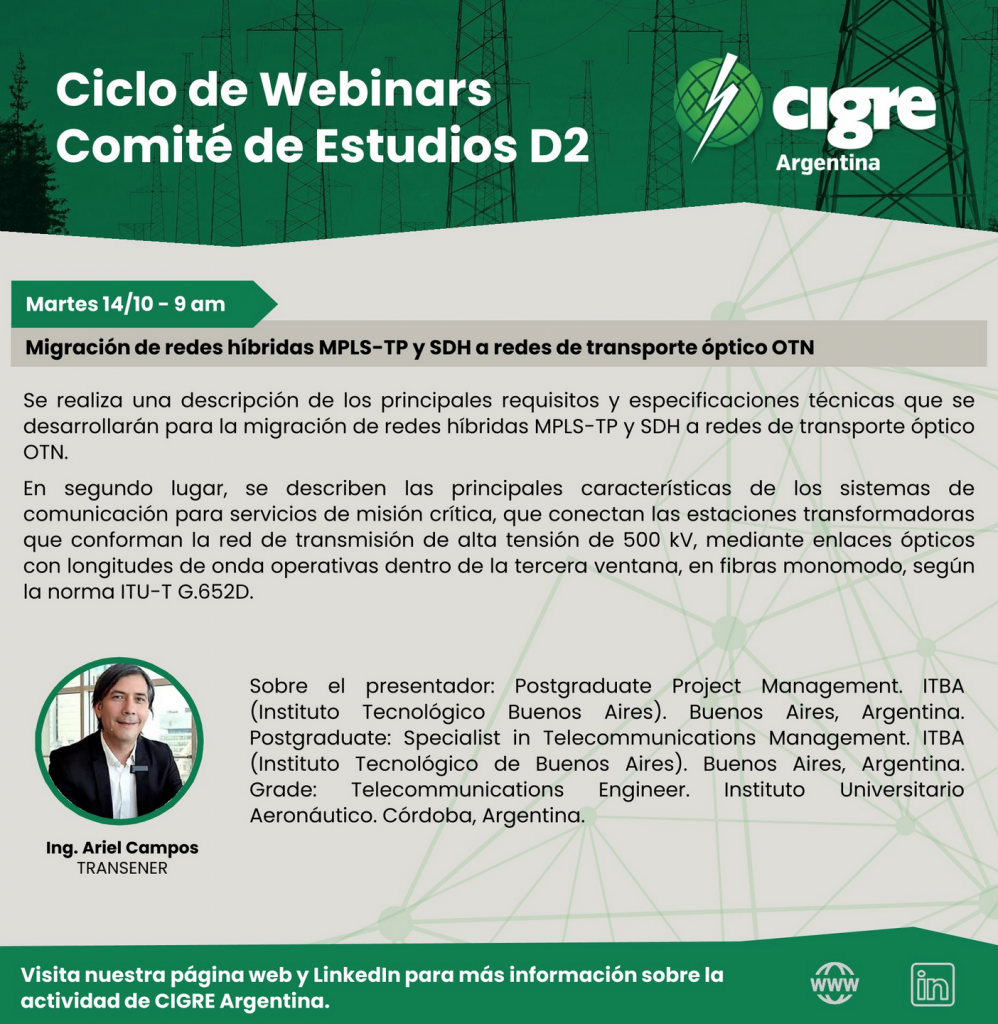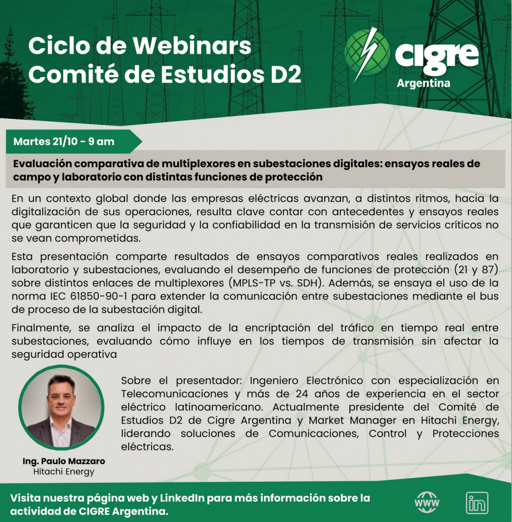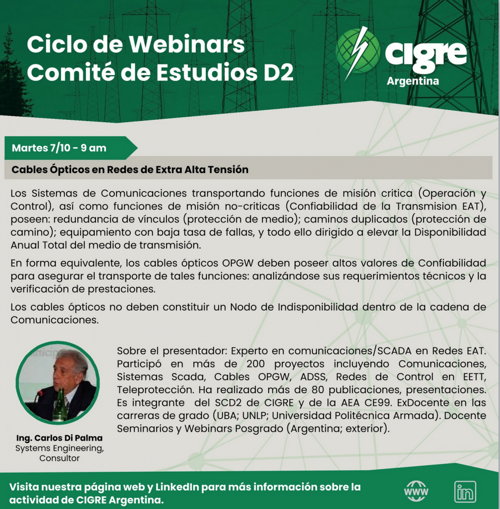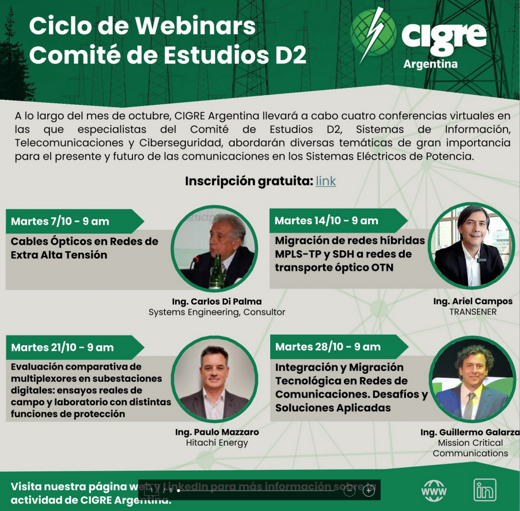 Los webinars serán presentados por los expertos Paulo Mazzaro, presidente del Comité de Estudios D2 de CIGRE Argentina, CARLOS ALBERTO DI PALMA, Ariel Campos y Guillermo Galarza.
