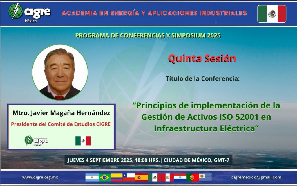 Hacemos una cordial invitación para que se unan a la Conferencia “Principios de implementación de la Gestión de Activos ISO 52001 en Infraestructura Eléctrica” dentro del ciclo de la Academia de Energía CIGRE México.